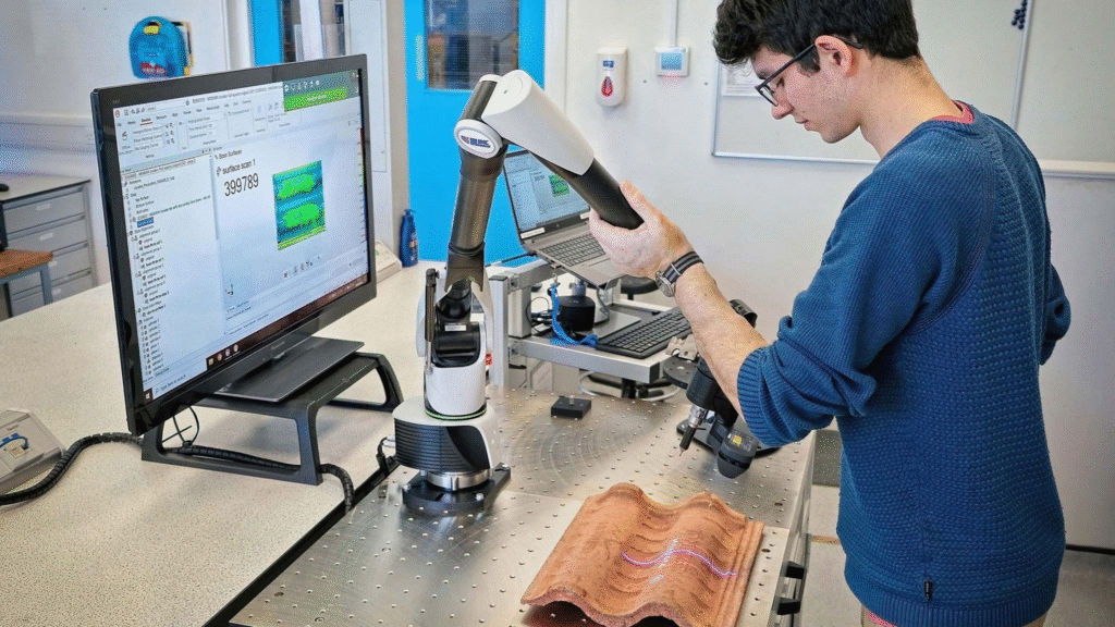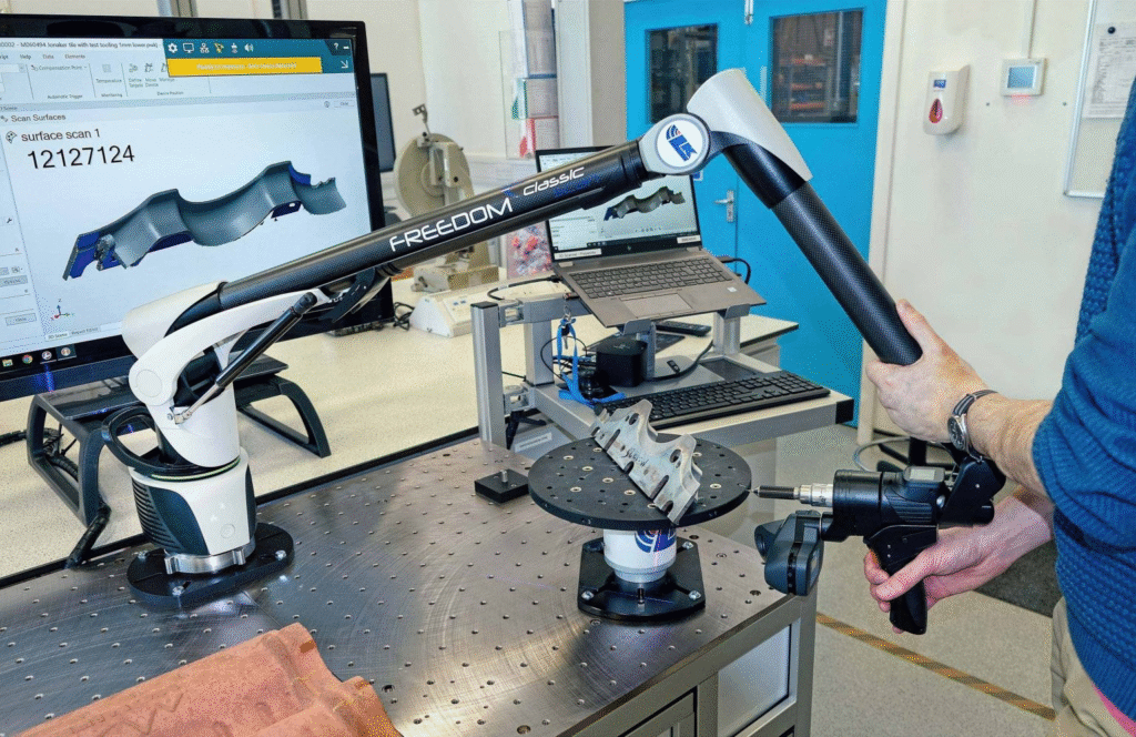 这正是欧洲领先的平屋面与坡屋面系统制造商 BMI集团 在克劳利技术中心的应用场景。自2024年7月起,设计工程师Luke Kelly及其团队开始使用由 LK Metrology 提供的一套便携式测量臂检测解决方案。此前,他们依赖一款体积更小、现已停产的测量臂与接触式探头,辅以卡尺、高度尺等传统手动测量设备。而新系统则由一台7轴、多传感器 FREEDOM Arm Classic Scan 组成,臂展2.73米,搭载接触式探头与 H120激光线扫描仪。H120自2023年底起由LK生产(此前隶属尼康计量的激光扫描硬件和软件业务)。该系统还包含一个直径300毫米的可旋转 FREEDOM Index Table,轻量化碳纤维测量臂安装于计量工作台上,均由LK供应。配套软件为 PolyWorks Inspector,用于点云分析、曲面评估、几何特征测量、生成彩色偏差色谱图(部件与CAD或扫描数据对比)、以及完整检测报告。