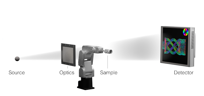 区别于传统接触式测量或破坏性检测,FiberScanner3D采用实验室级X射线张量层析成像(XTT)技术,无损表征复合材料内部各向异性结构。系统通过分析材料内部X射线定向散射特性(而非直接成像单根纤维),重建包含纤维取向、排列度及体积分数的完整3D图谱。这项曾仅限同步辐射光源设施的技术,现已可在标准实验室环境中应用。