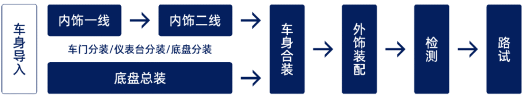 车身合装:将底盘总成、车轮等分装模块与车身进行合装,完成整车的基本结构装配。