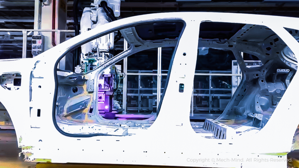- Mech-Eye工业级3D相机体积超小,安装灵活,随机器人运动到B柱内侧对其微小特征孔进行扫描。