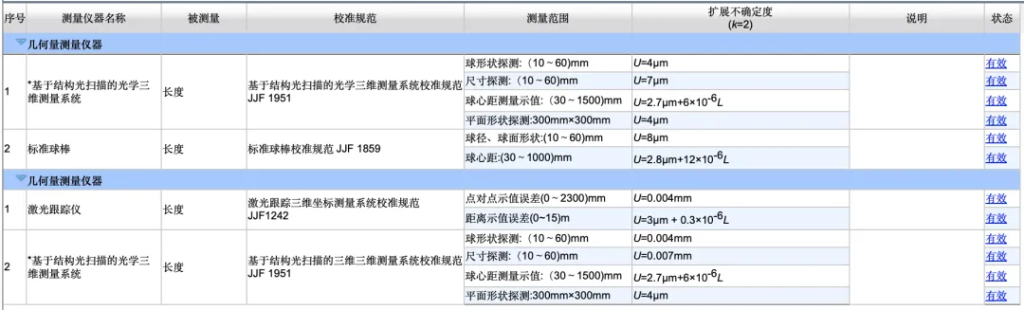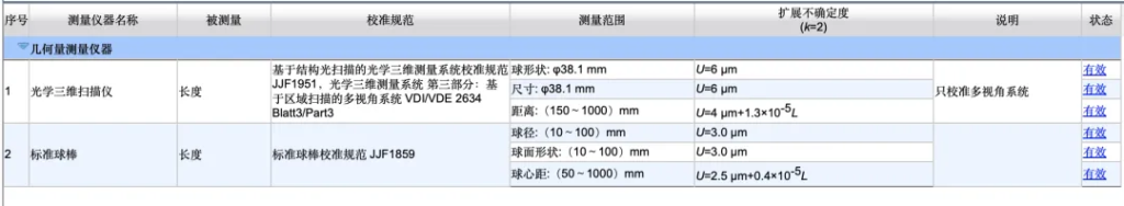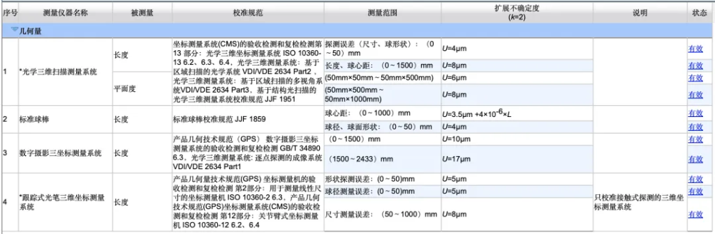 先临三维科技股份有限公司精度实验室–认可的校准和测量能力范围