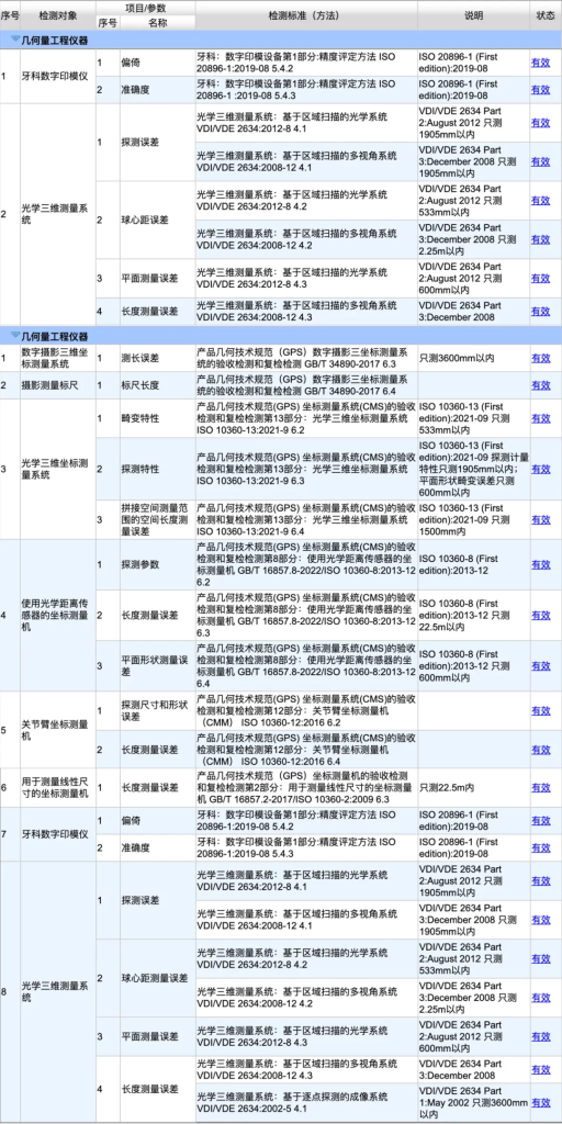 先临三维科技股份有限公司精度实验室–认可的检测能力范围
