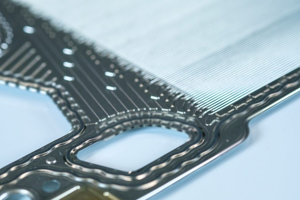 双极板是燃料电池的核心部件。在一个电池中多达600片双极板叠加,它们不仅承担电连接功能,还负责反应气体和水的分配与排放。金属双极板由厚度不到0.1毫米的金属箔双面压制而成,成形过程中的微小参数波动可能导致典型缺陷,例如开裂、起皱或弹跳效应,从而影响燃料电池的功能和耐久性。以往,这类缺陷只能通过下游抽检方式随机发现。为解决这一难题,作为弗劳恩霍夫协会与德国研究基金会(DFG)合作的一部分,弗劳恩霍夫光学与精密工程研究所(IPM)、斯图加特大学及其工业合作伙伴蒂森克虏伯自动化工程公司、克鲁特化学公司共同研发出传感器技术和仿真方法,为双极板批量生产中的主动过程控制与工艺优化奠定基础。