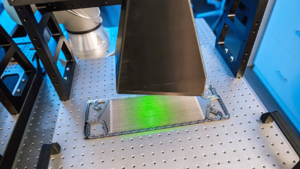 弗劳恩霍夫(IPM )开发的数字全息3D传感器能够实时采集组件表面的高精度三维数据,并用于过程控制。为适应不同尺寸的双极板,研究人员采用了可扩展系统,通过增加测头数量来覆盖更大测量范围。由多个测头组成的“矩阵传感器”可在一次测量中完成对尺寸达 400 mm × 150 mm 的双极板全表面扫描,整个过程不到一秒,且无需移动传感器。拼接算法将各测区数据合成为完整图像,高分辨率结果能够清晰呈现几微米的成形缺陷。目前,该系统已在斯图加特大学成形技术研究所(IFU)接近量产环境中进行测试。