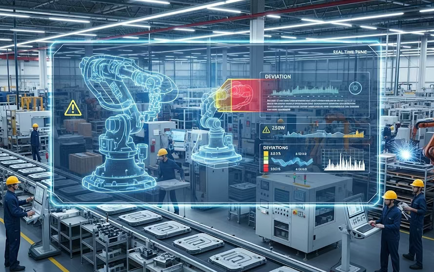 数字孪生彻底改变了这一方式。它通过将实时传感器数据、制造执行系统(MES)以及计量结果与虚拟模型连接,创造了了生产环境的实时、可演化副本。这意味着偏差、磨损或装配错位可以被即时检测、分析甚至预测,无需等待生产线末端的检验结果。