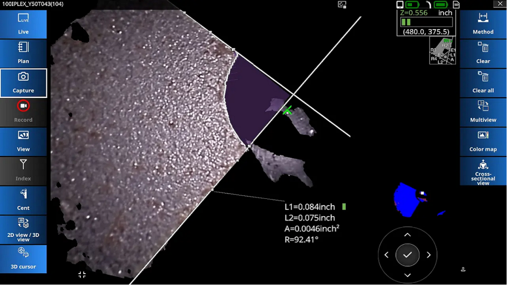 IPLEX One 搭载 Evident 首创的 Swoptix 多视角技术,用户可在近距离与远距离、直视与侧视之间即时切换,无需取下探头,从而缩短检测时间并降低接头适配器的磨损。减少探头回缩次数与评估时间后,IPLEX One 的生产效率可提升至传统 RVI 系统的两倍,而操作疲劳和设备磨损仅为一半。此外,IPLEX One 配备独家 3DAssist 软件 支持的单目 3D 建模功能,可通过单条光路生成高精度 3D 图像,无需立体探头。