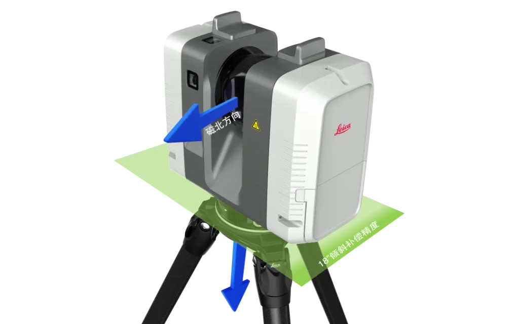 徕卡RTC360使用算法基于IMU实现高精度倾斜测量模式,通过GNSS定位,结合地球重力场模型,获得测站当地准确的重力加速度,在设备扫描前进行360°旋转后,便可获得18″倾斜精度。