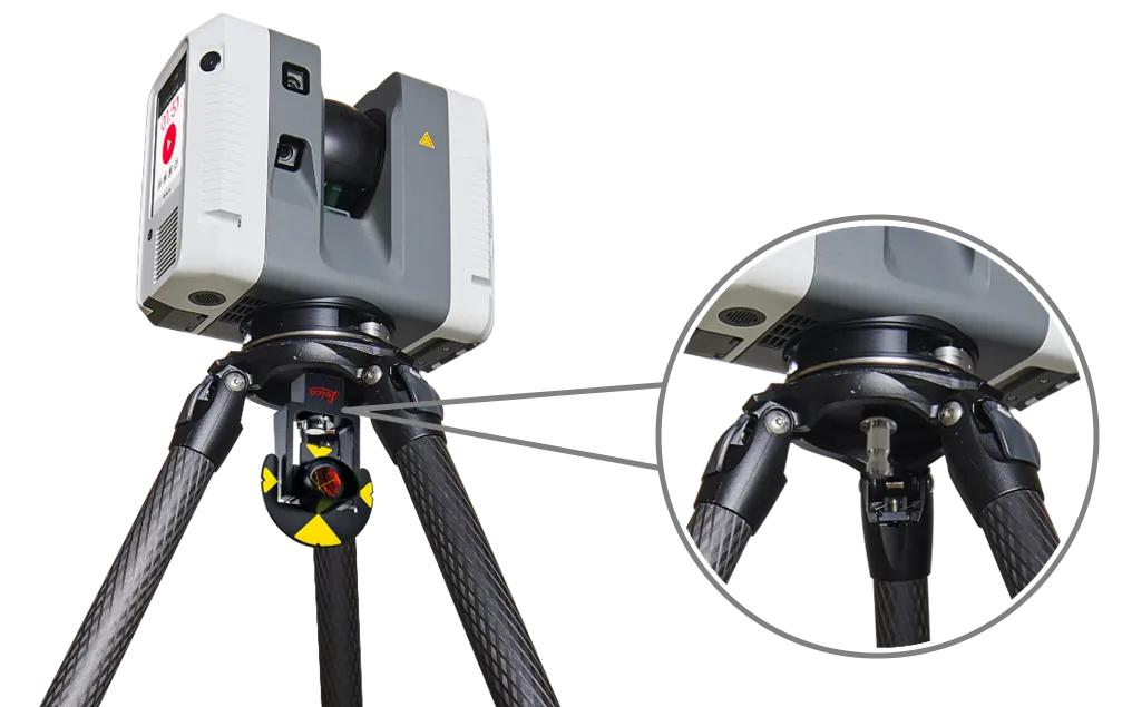 为了降低方案成本并提升配件可靠性,徕卡RTC360“半移动”扫描方案充分考虑了徕卡工程测量配件的通用性,无需额外配件投入,使用仪器原装的GST80碳纤维脚架,直接在脚架中心螺孔中装配CNC精密加工的棱镜转接配件,整体同轴度优于1mm。