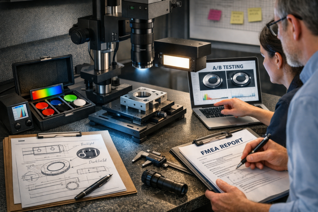 如果您正在协调第三方检验或供应商审核,合作伙伴可以帮助您在零件进入生产线之前记录批次间的差异。将光源视为一个经过校准的子系统。使用平场目标(用于测量空间均匀性)和短时间序列(用于量化强度漂移和闪烁)建立基线。保留少量参考图像和经过认证的边缘工件,以验证端到端系统性能。轻量级的维护节奏效果良好:每日快速检查投资回报率 (ROI) 并与基线进行比较,每周进行均匀性漂移快照,每季度进行重新验证,或在夹具、驱动器或上游表面处理发生任何变化时进行重新验证。