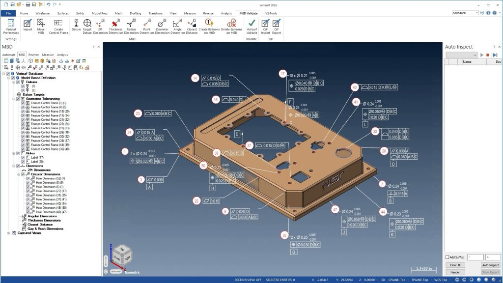 Verisurf 2026 支持直接导入 QIF 文件,包括 CAD 几何、GD&T 标注、尺寸、公差及特征定义 ID,可用于零件检测。系统还能根据导入的 PMI 自动生成检测方案,便于快速完成检测程序编制。最终方案可通过 Verisurf Auto Inspect 在 CMM 或其他设备上执行零件检测。