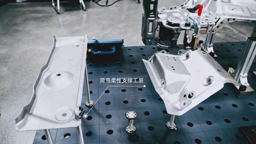 对于大尺寸、复杂结构的总成件,例如白车身侧围、底盘总成等,可采用带夹具的柔性工装实现钣金件形态固定。