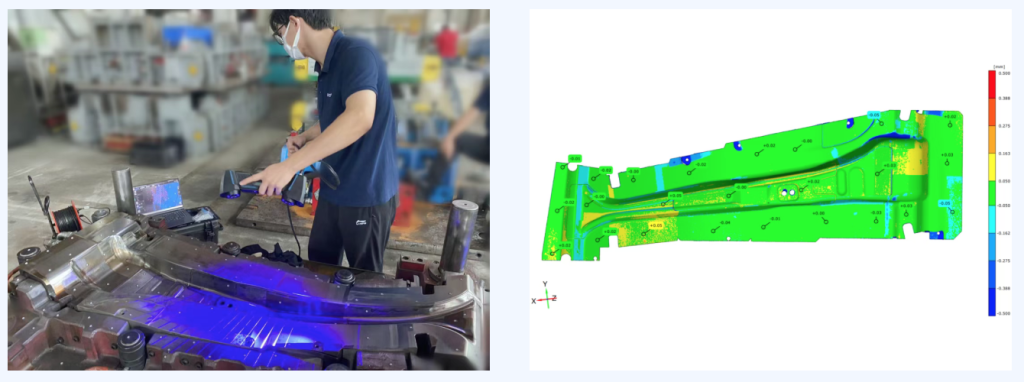 汽车冲压模具通常尺寸较大、异形曲面多,且精度要求较高,使用三维扫描仪进行全尺寸检测,整体过程十分便捷,从而保障生产的模具尺寸合格。