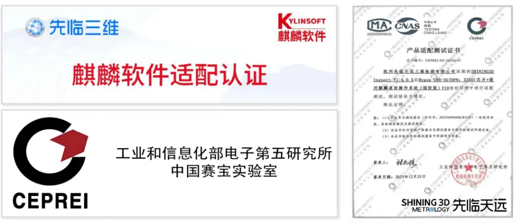 SHINING3D Inspect是先临三维潜心研发的成果,拥有完全自主知识产权,关键算法技术自主可控。软件已顺利完成与麒麟操作系统及信创国产硬件的适配认证,为关键领域的应用提供了坚实的安全保障,是推动工业软件国产化替代的重要力量。