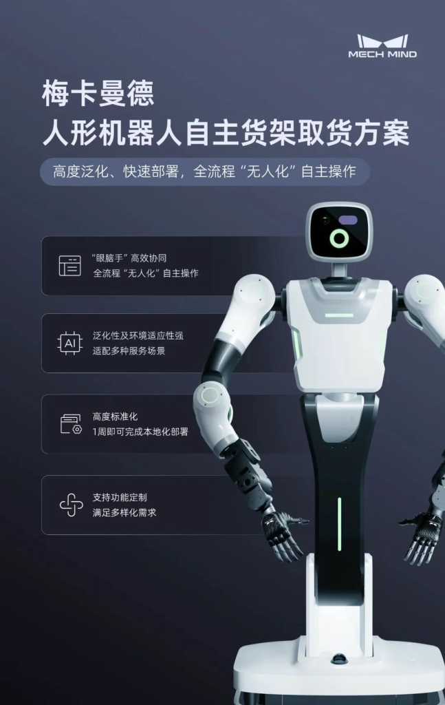 部署高效灵活梅卡曼德人形机器人自主货架取货方案高度标准化,软硬件产品操作简单、部署便捷,标准方案一周内即可完成所需场景的本地化部署。