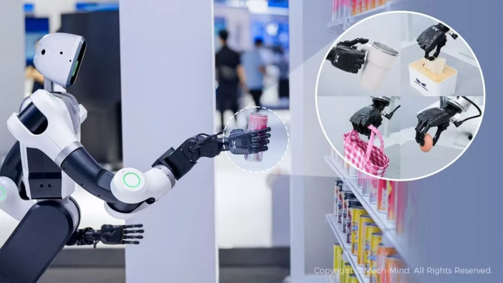在“眼+脑”的配合下,再通过梅卡曼德自主研发的Mech-Hand五指灵巧手,机器人便可以精准抓取目标货品,实现“感知-决策-执行”的能力闭环。Mech-Hand五指灵巧手具备多个关节及自由度,能够像人手一样灵活、精细操作物体,并更好适应狭窄复杂的真实货架空间。