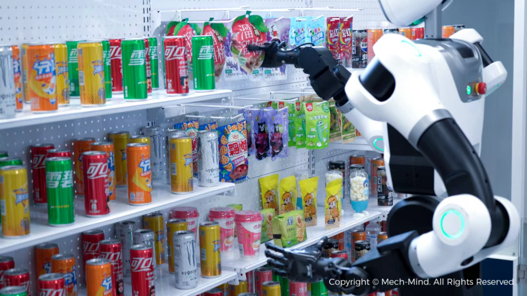 由Mech-Vision、Mech-DLK、Mech-Viz等多款自研智能软件组成的“AI大脑”,则能够让机器人智能高效处理Mech-Eye获取的图像数据,即使在货品形态多样、混合摆放等复杂情况下,也能精准识别和定位目标货品,并自主规划行动路径和抓取方式。