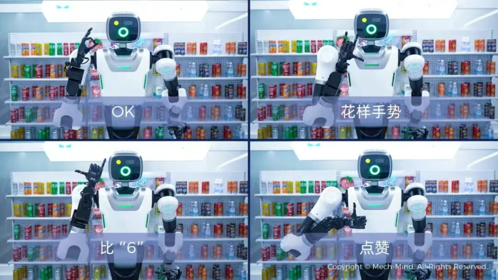 方案还针对货架取货场景特别建立了Mech-Hand手势库,包含五指抓握、两指/三指抓取及释放、食指按压、单击与双击等动作,可满足常见商品的抓取需求。