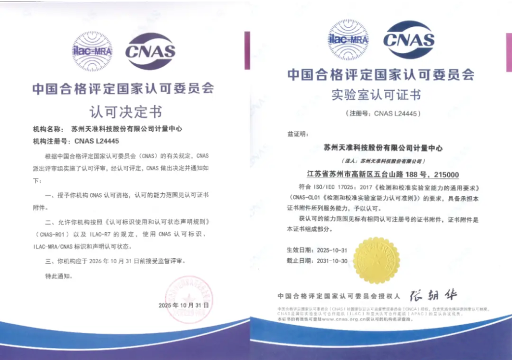 作为科创板首批上市公司,天准科技自2005年成立以来,始终保持高强度研发投入,在精密计量领域积淀深厚。2013年,公司牵头国家重大科学仪器开发专项,成功研制精度0.3μm的复合式坐标测量仪,实现国产高端计量装备的重要突破。历经多年深耕,天准影像测量仪、坐标测量仪等核心产品关键部件已实现自主研发,并将AI技术深度融入测量系统,通过自研智能特征提取算法,推动测量过程自动化,大幅提升效率、降低人工成本。2025年,天准科技计量中心获国家CNAS实验室认可(注册号:CNAS L24445)。