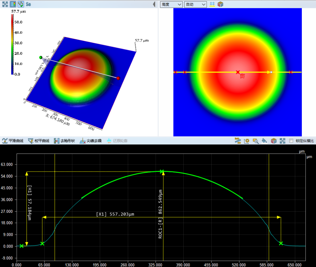 对于应用在芯片端各种不同类型的复杂非球面透镜的测量挑战,白光干涉三维重建算法提供了更优解:它不仅实现了高精度重建,更从根本上解决了传统超景深显微镜、共聚焦显微镜、探针式轮廓仪等三维方法解析不稳定、低精度低效率的技术痛点。